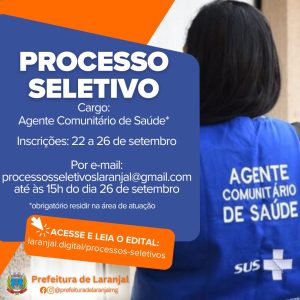 Processo seletivo: Agente Comunitário de Saúde ▪️ Inscrições: 22/09 até às 15h do dia 26/09 ▪️ Enviar inscrição pelo e-mail: processosseletivoslaranjal@gmail.com ▪️ Obrigatório residir na