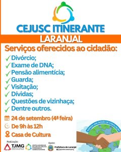 CEJUSC ITINERANTE EM LARANJAL Você sabia que é possível resolver conflitos de forma rápida e gratuita sem entrar com uma ação judicial? ◾ Dia 24/09
